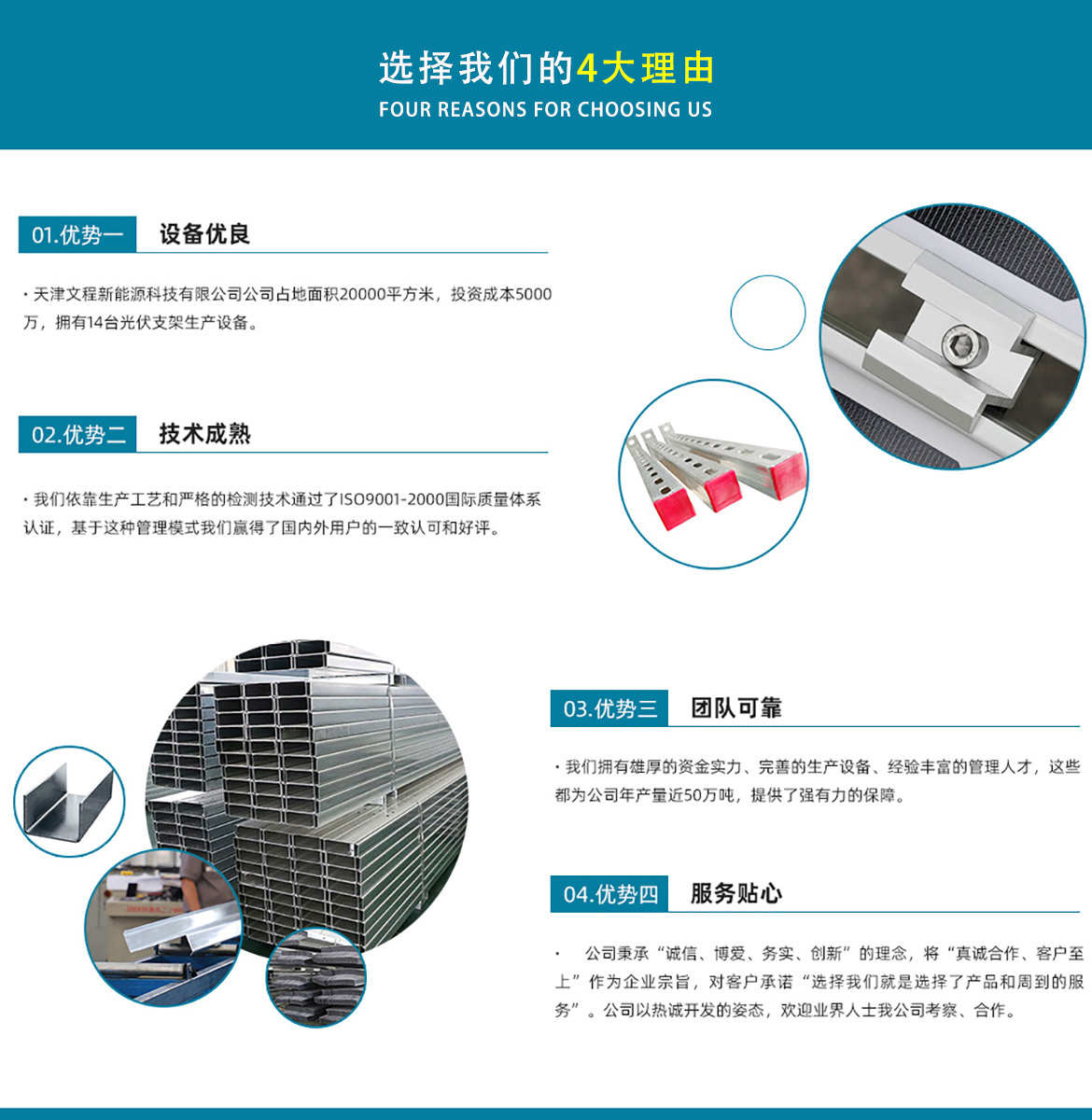 天津文程新能源科技有限公司成立于2021年,是專注于集中式、分布式、漁光互補和農(nóng)光互補等清潔能源發(fā)電的綜合性企業(yè) 公司是集設(shè)計、研發(fā)、生產(chǎn)、制造為一體的綜合型企業(yè)。公司占地面積20000平方米,注冊資金5000萬元整。公司坐落于華北鋼鐵重鎮(zhèn)--大邱莊,距天津市區(qū)50公里、鄰104和205國道及京滬高速,交通十分便捷。 本公司擁有三個生產(chǎn)車間,其中兩個冷彎型鋼車間,一個鋅鋁鎂型鋼車間,擁有自動冷彎成型機10條,自動數(shù)控沖孔機10條以及焊接加工等設(shè)備。主要生產(chǎn)產(chǎn)品有:太陽能光伏支架、各種規(guī)格的C/Z/U型鋼、抗震支架、管廊支架及整套配件等。